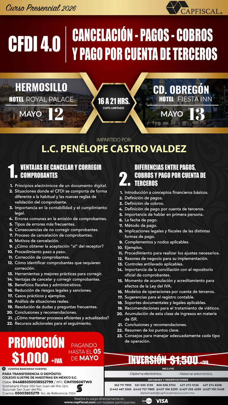 Estimados Participantes Curso Presencial 2026 SEDE: HERMOSILLO PROMOCIÓN Para solicitar mayor información, pueden comunicarse a nuestra oficina WHATSAPP Para realizar reservaciones y compras:
