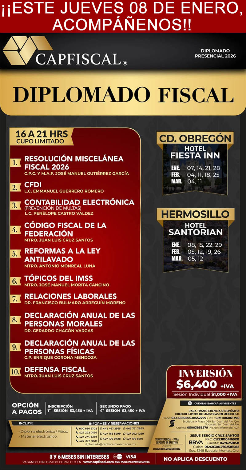Para realizar reservaciones y compras: https://capfiscal.com/producto/diplomado-fiscal-2026-hermosillo/ (NO APLICA DESCUENTO A MESES SIN INTERESES)